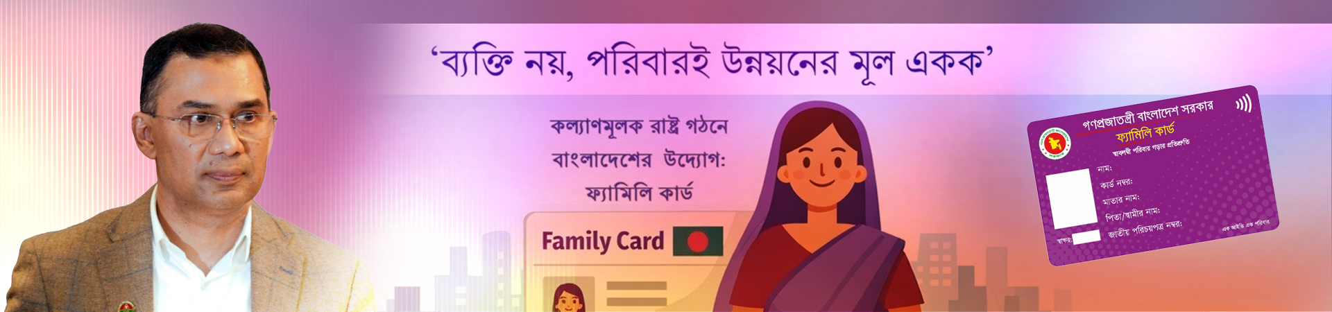 ফ্যামিলি কার্ড সাধারণত সরকারের একটি সামাজিক সহায়তা বা তথ্যভিত্তিক কার্ড, যেখানে একটি পরিবারের সদস্যদের মৌলিক তথ্য একসাথে নথিভুক্ত থাকে। নারীর ক্ষমতায়নের মাধ্যমে নারীর অধিকার ও নারীর মর্যাদা নিশ্চিতকরণ, পরিবারের খাদ্য নিরাপত্তা স্বাস্থ্য ও শিক্ষা উন্নযনের লক্ষ্যে ‘ফ্যামিলি কার্ড’ কর্মসূচি চালুর উদ্যোগ নিয়েছে বর্তমান বিএনপি সরকার। এই কার্ডের মাধ্যমে নির্বাচিত পরিবারগুলোকে নিয়মিত নগদ সহায়তা দেয়া হবে। এই কর্মসূচির মূল দর্শন হচ্ছে “ব্যক্তি নয়, পরিবারই উন্নয়নের মূল একক”। পাইলটিং কর্মসূচিতে প্রথম পর্যায়ে ১৪টি ইউনিটে ১০,০০০ পরিবারকে এ কার্ড প্রদান করা হবে। পরবর্তীতে প্রতি ধাপে ১০,০০০ করে বৃদ্ধি করে জুন ২০২৬ এর মধ্যে বিভিন্ন ইউনিটে ৪০০০০ পরিবারকে ফ্যামিলি কার্ডের আওতাভুক্ত করা হবে। তবে জরিপকৃত সকল পরিবারকেই ফ্যামিলি কার্ড প্রদান করা হবে।